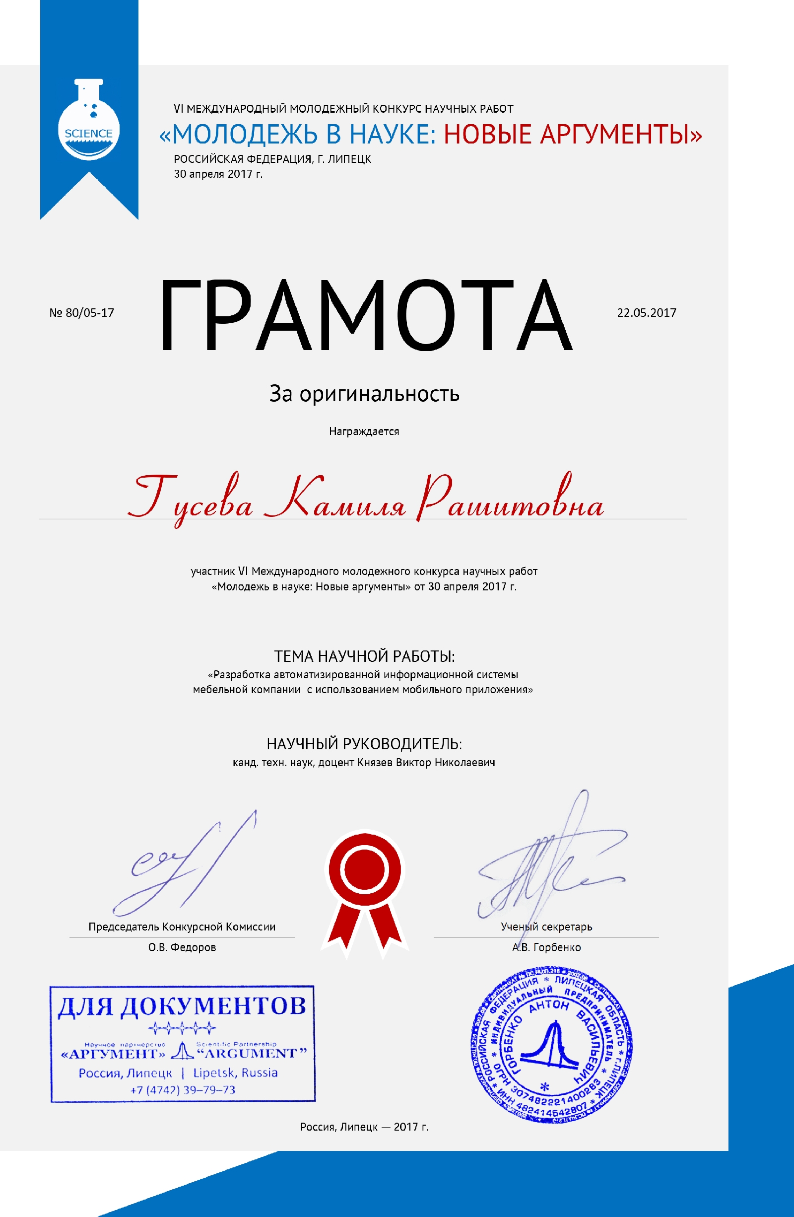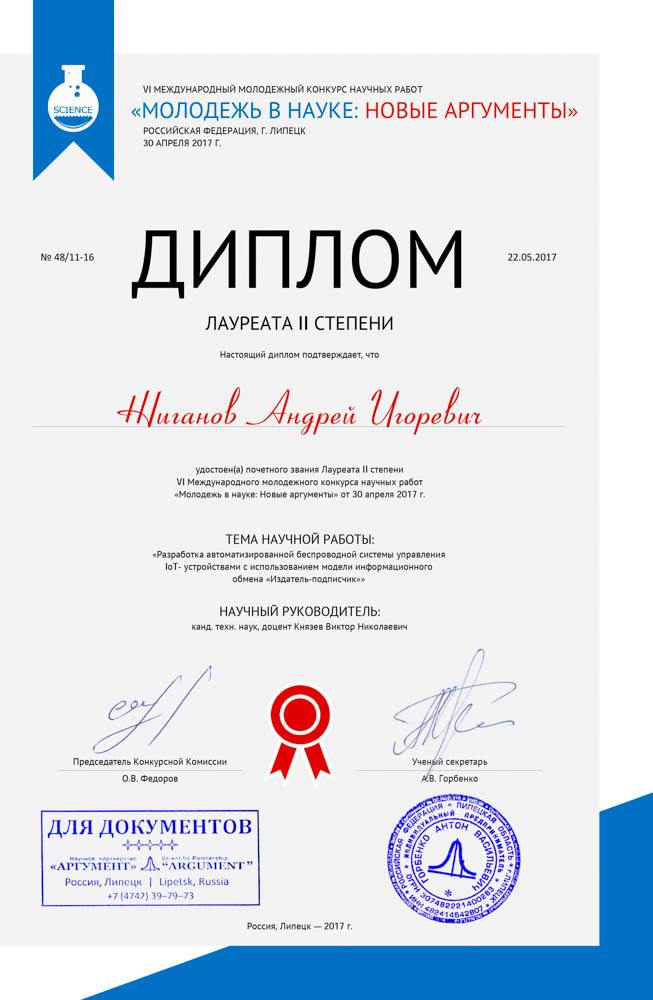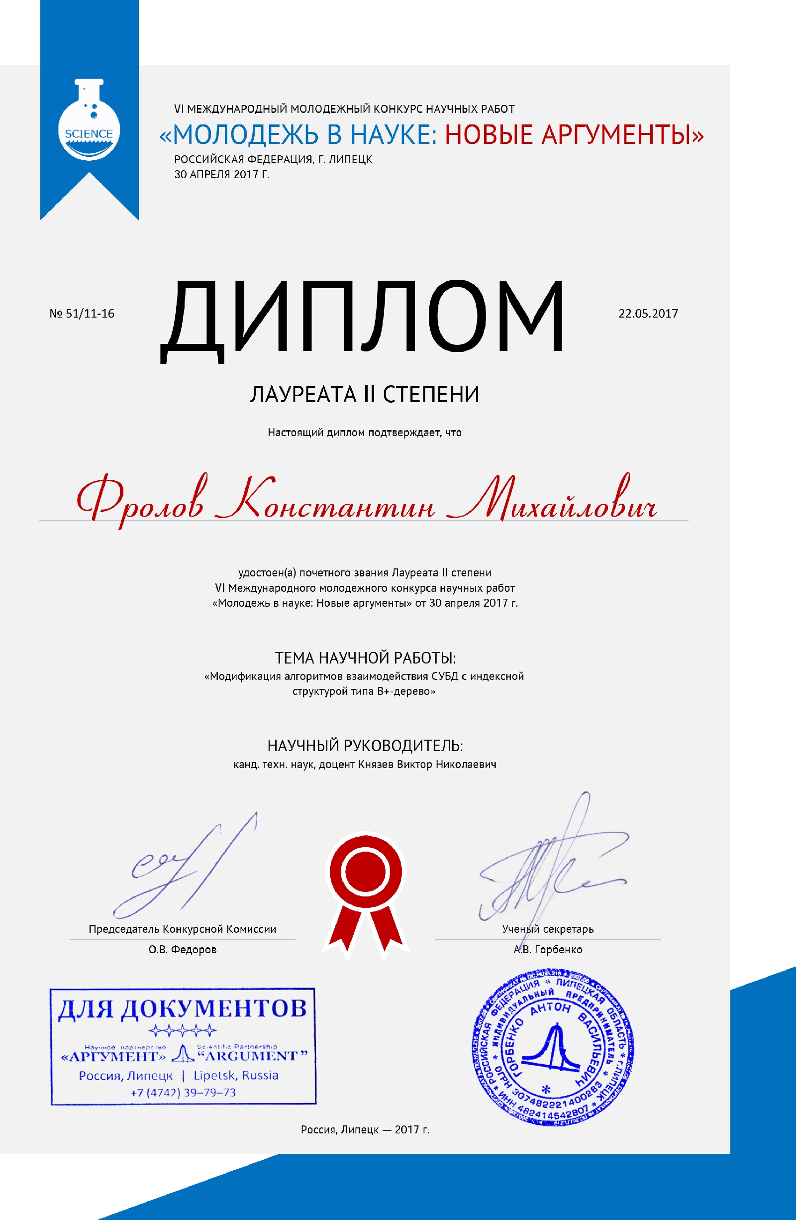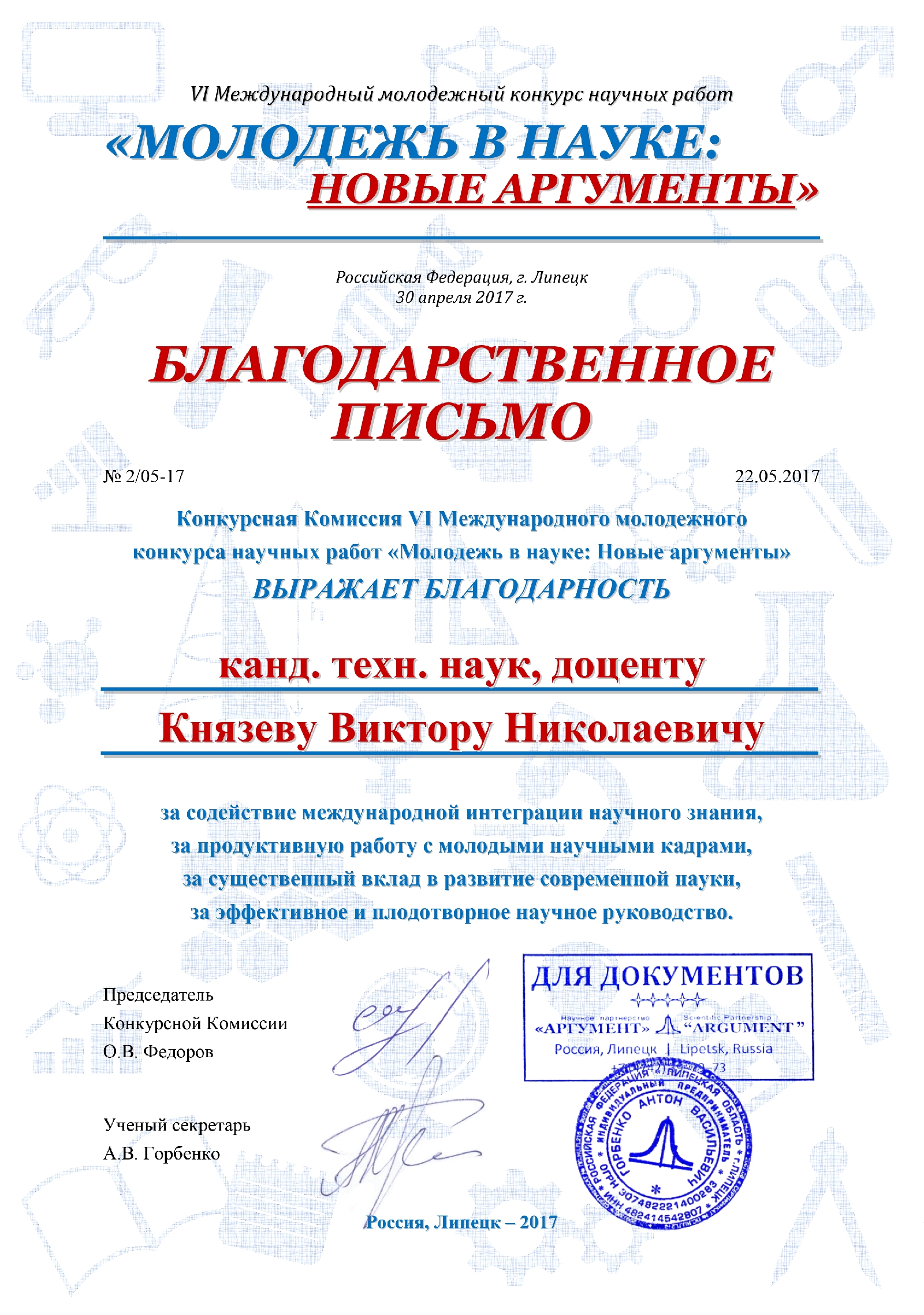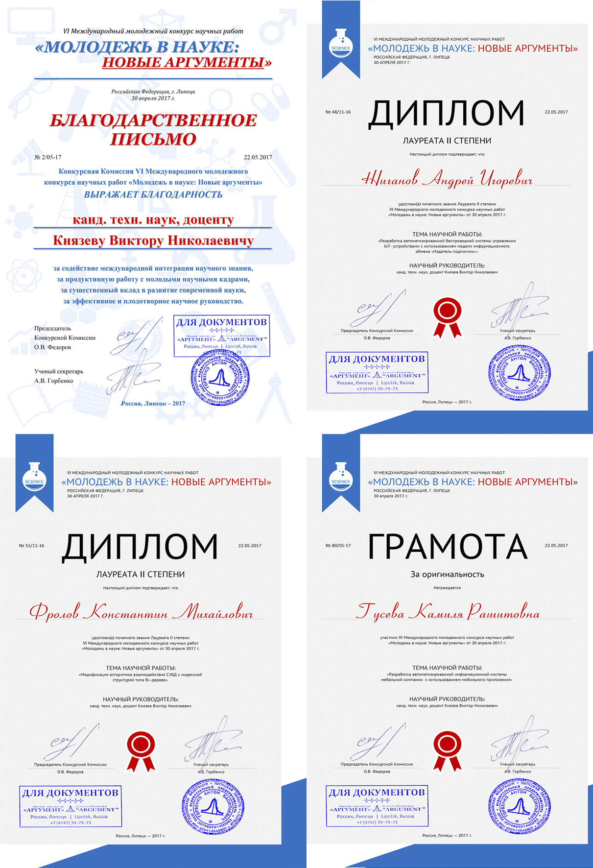 В мае 2017 года студенты кафедры "МО и ПЭВМ" ФВТ Фролов К. (гр. 15ВПм1) и Жиганов А. (гр.15ВП1) стали лауреатами VI Международного молодежного конкурса научных работ "Молодежь в науке: Новые аргументы", а студентка Гусева К. (гр. 13ВИ1) – победителем данного конкурса в номинации "За оригинальность". Научный руководитель указанных студентов к.т.н., доцент кафедры "МОиПЭВМ" Князев В.Н. получил Благодарственное письмо Конкурсной комиссии VI Международного конкурса.