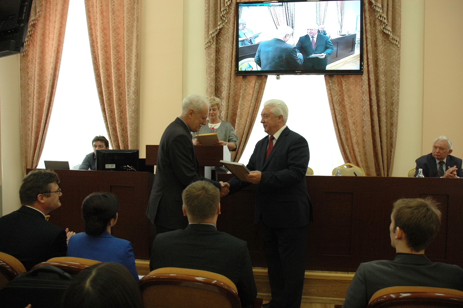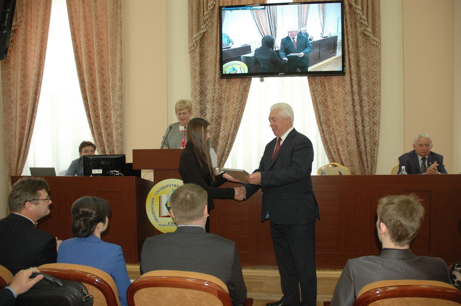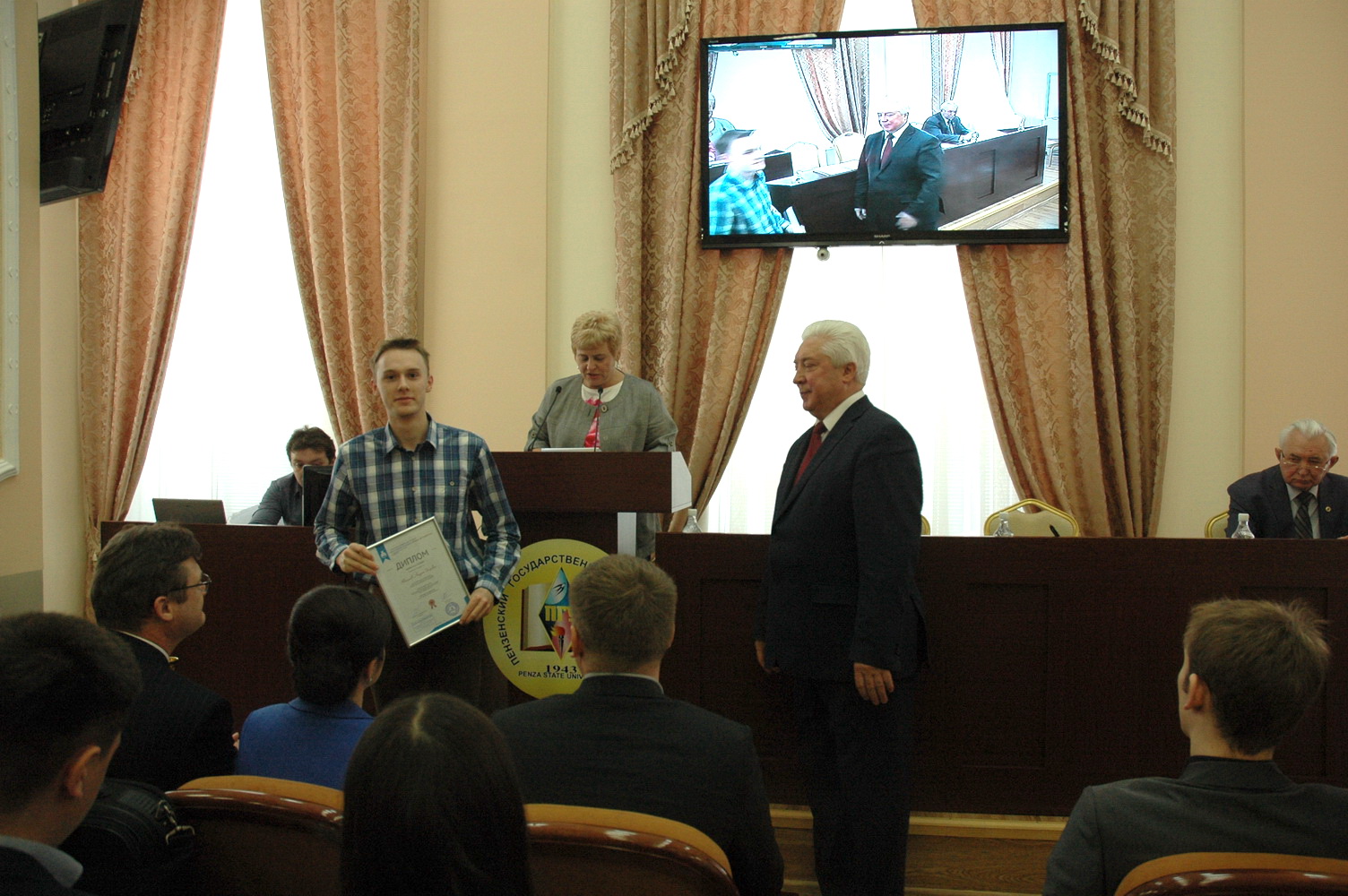 На майском заседании Ученого совета ПГУ состоялось награждение преподавателей, сотрудников и студентов университета грамотами и дипломами. Среди награжденных были студенты кафедры "МО и ПЭВМ" ФВТ Фролов К. (гр. 15ВПм1) и Жиганов А. (гр.15ВП1), ставшие лауреатами VI Международного молодежного конкурса научных работ "Молодежь в науке: Новые аргументы", студентка Гусева К. (гр. 13ВИ1), ставшая победителем данного конкурса в номинации "За оригинальность", а также научный руководитель указанных студентов к.т.н., доцент кафедры "МО и ПЭВМ" Князев В.Н., получивший Благодарственное письмо Конкурсной комиссии VI Международного конкурса.![]()