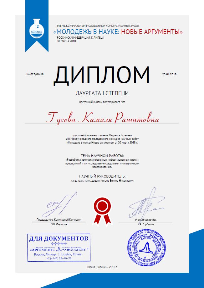 Магистранты кафедры "МО и ПЭВМ" ФВТ Чернов А. (гр.17ВПм1), Гусева К. (гр. 17ВИм1) и выпускница магистратуры кафедры прошлого года Серикова Ю. (гр. 15ВПм1) стали лауреатами первой степени VIII Международного молодежного конкурса научных работ "Молодежь в науке: Новые аргументы".